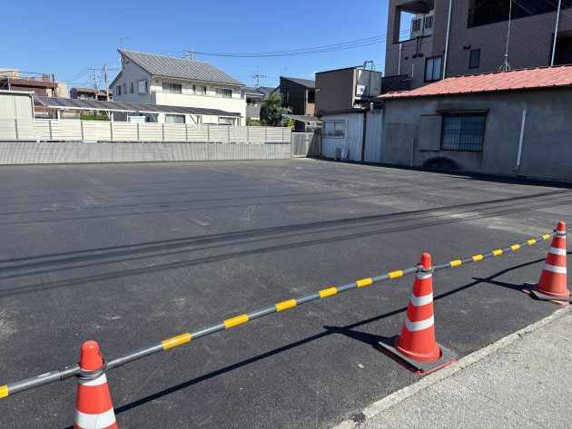 国道沿いの敷地をコインパーキングとして活用するため、歩車道の切り下げ工事と駐車場舗装を行った現場です。